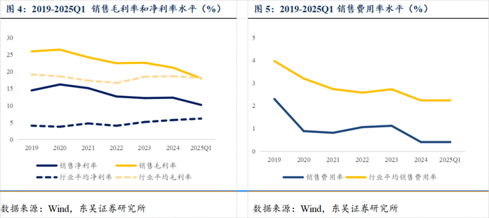 注:图4-7中的行业平均线,均是通过计算申万二级行业指数的各项费用和主营收入的比值,得到相应的费用率,而不是单个公司的相应费用率的加权平均,这种计算方法在行业集中度比较高的时候,可能会突出主营收入较大的公司的影响,弱化主营收入较小的公司的影响。
