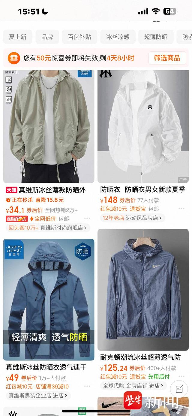 防晒衣更是近期各家商业app网站防晒品货架上的“天王商品”,浏览某网站的防晒衣,晒出的款式绝对超过数百种款式,记者发现,今夏男款防晒衣依旧以白色、浅青色、米色、淡蓝色、紫色等单色系为主,价格从几十元到数百元不等。