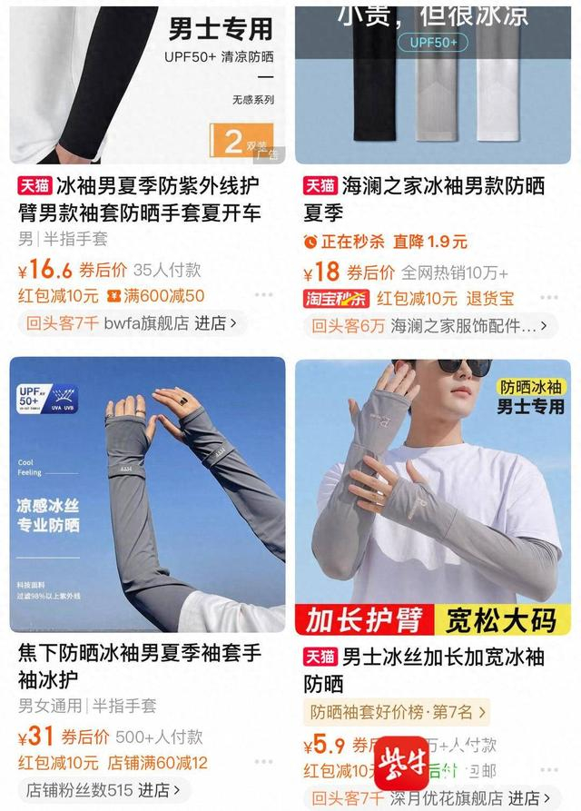 今天下午,扬子晚报/紫牛新闻记者在某网站搜索“防晒”两个字,一下子跳出防晒衣男款、防晒衣时尚女款、防晒衣男款冰丝、防晒袖套、防晒帽等多种词条。以防晒袖套为例,商家打出“夏日白手臂的秘密武器”,在某网站,商家考虑到男士爱户外运动、喜欢开车,因此今年男士防晒冰袖、防晒手套都有不少热衷购买的“铁粉”。