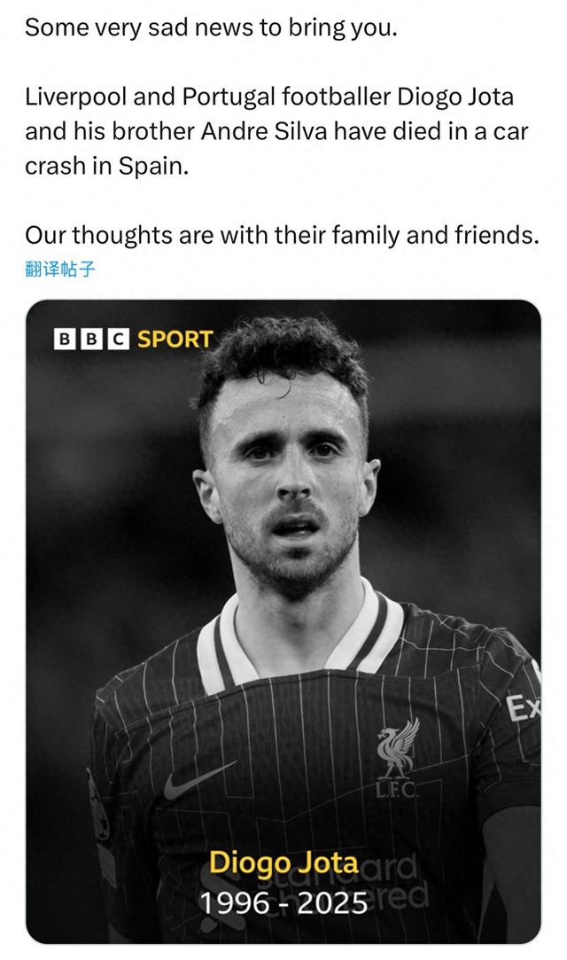 利物浦球星若塔因车祸丧生:年仅28岁,十天前刚结婚