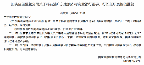 广东南澳农商行董事、行长杨友清任职资格获批 金融一线 2025.07.0319:18 关注 7月3日金融一线消息,汕头金融监管分局发布《关于杨友清广东南澳农村商业银行董事、行长任职资格的批复》,核准杨友清广东南澳农村商业银行董事、行长的任职资格。