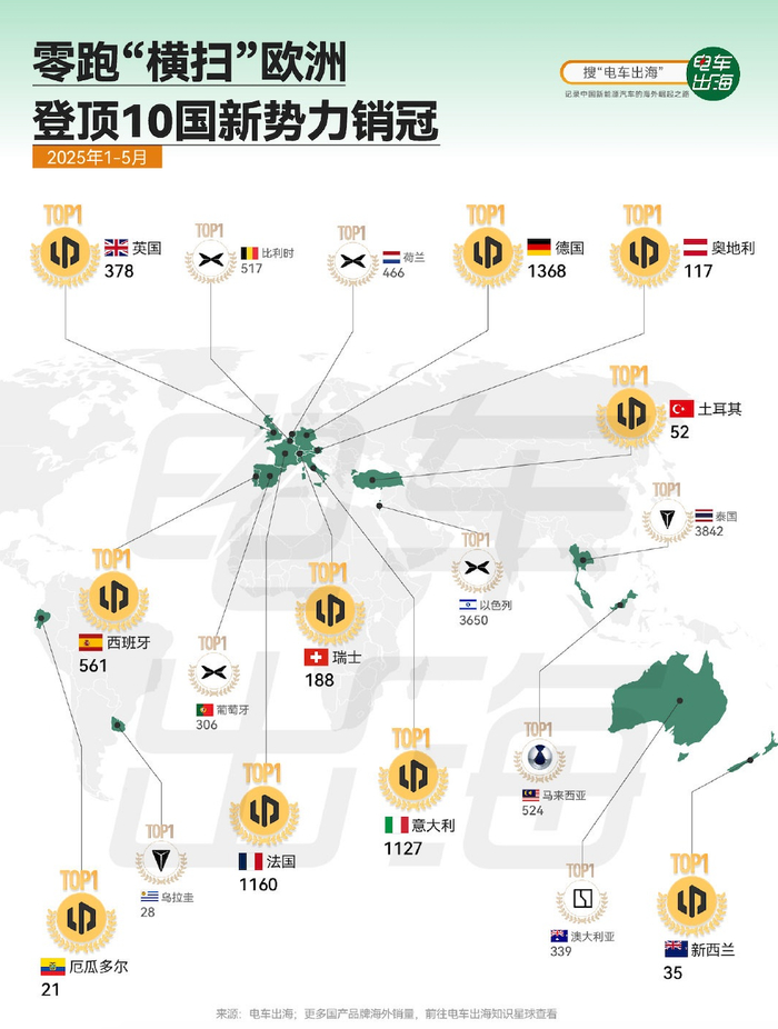 零跑汽车的全球化布局同样进展迅速。2025年前5个月,零跑汽车以超过17200台的出口量位居新势力出海首位;计入6月数据后,上半年出口领先地位已无悬念。在准入标准严苛的德国、英国等10个欧洲国家,零跑均取得了新势力品牌销量冠军的佳绩,且其海外销量的84%由欧洲本地消费者贡献。
