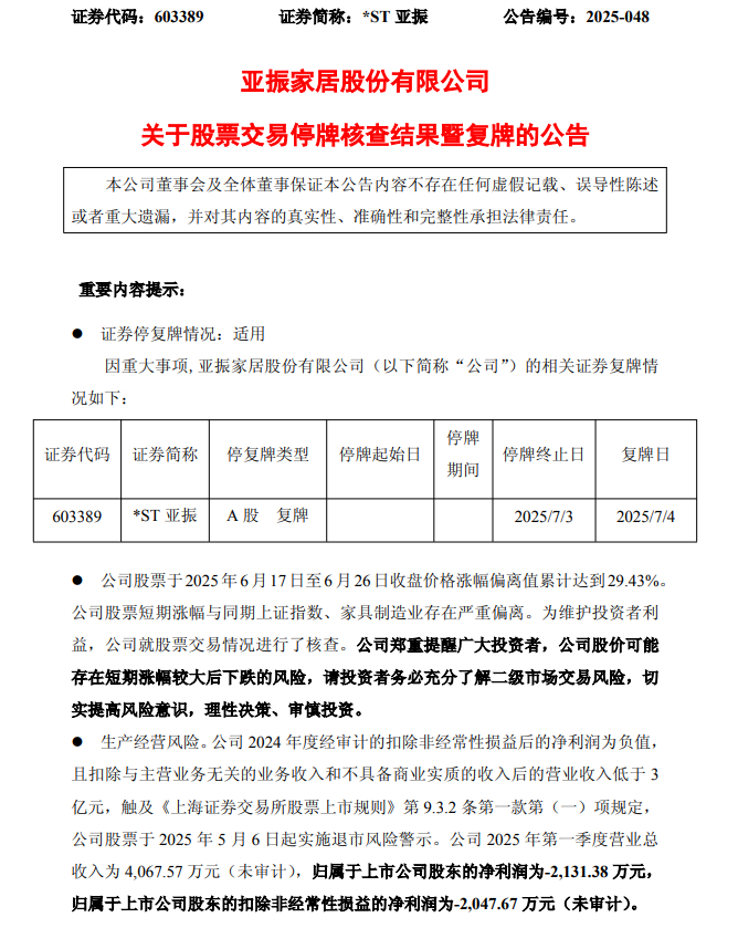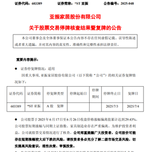 7月3日,*ST亚振(603389.SH)发布股票停牌核查结果暨复牌公告。公司股票自2025年6月27日开市起停牌,停牌期间不超过5个交易日,将于2025年7月4日(星期五)开市起复牌。