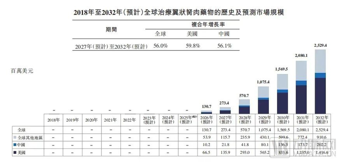 根据弗若斯特沙利文报告,预计到2032年,全球翼状胬肉患者将达到10.771亿人。其全球治疗药物市场规模预计将于2027年达到2.73亿美元、2032年达到25.29亿美元,复合年增长率为56.0%。