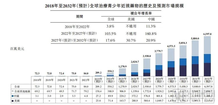 CBT-009背后是一个庞大的青少年近视药物市场。弗若斯特沙利文报告显示,全球治疗青少年近视药物的市场规模由2018年的7230万美元增加至2022年的8400万美元,复合年增长率为3.8%。预计于2027年将达到29.3亿美元,于2032年将达到65.97亿美元,2022年至2027年、2027年至2032年的复合年增长率分别为103.5%及17.6%。尤其是,美国尚无获批用于治疗青少年近视的阿托品药物。