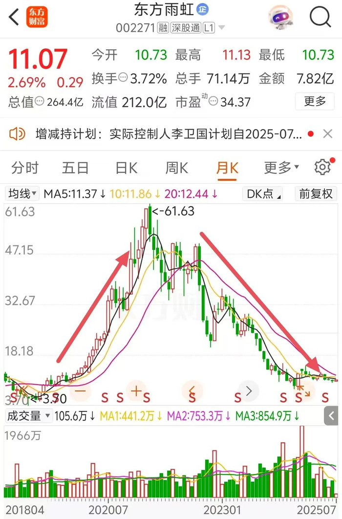 张蓓发上述朋友圈时,东方雨虹股价尚在22元附近(前复权,下同)。到李卫国首次宣布减持时,股价已经跌到16元,李卫国首次减持均价即为16.08元。如今,东方雨虹股价跌到11元附近,比张蓓发朋友圈时已经“腰斩”,2024年9月股价最低跌至8.23元。截至7月3日收盘,东方雨虹总市值为264.4亿元,比高峰期缩水超八成。