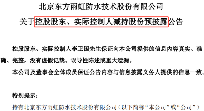 公告显示,持有东方雨虹5.31亿股(占公司总股本的22.22%)的控股股东、实际控制人李卫国计划在公告披露之日起15个交易日后的3个月内,以大宗交易和/或集中竞价交易方式减持公司股份不超过4638.22万股(占公司总股本的比例不超过1.94%)。按7月3日收盘价计,此番减持预计可套现约5亿元。