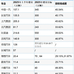 上半年部分国内车企销量及全年目标完成情况