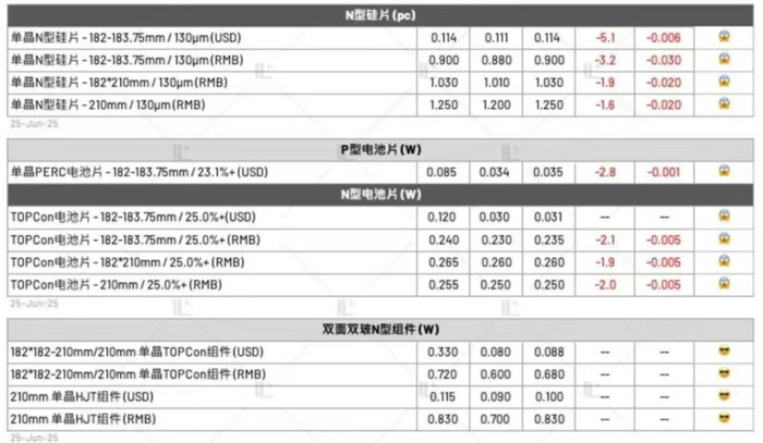 电池片环节,N型TOPCon210电池片6月25日成交均价比5月初降低了2.5分/W;同期硅片环节的单晶N型210R硅片和210硅片成交均价也分别下降1.2-1.3毛/片。另据中国有色金属工业协会硅业分会数据,同期N型复投料和N型致密料每吨价格也分别下降了4800元和3700元。