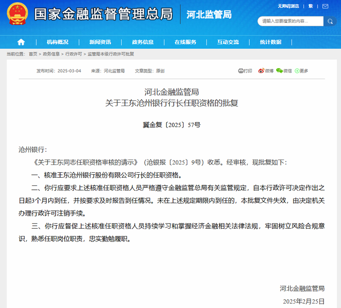 河北金融监管局于今年3月4日连续发布行政许可批复,根据批复内容,王东将正式出任沧州银行党委副书记、行长一职。