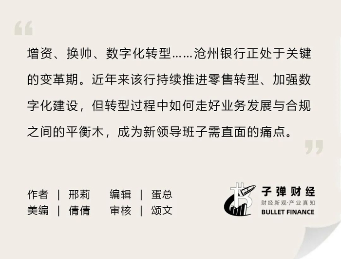 总体来看,增资、换帅、数字化转型……沧州银行正处于关键的变革期。未来,沧州银行能否在新任领导班子的带领下,持续优化业务结构、加强资产质量管控、在零售转型的道路上稳健前行,「子弹财经」将持续关注。