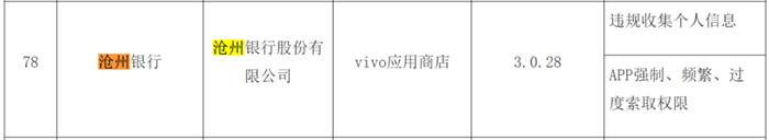 2025年5月16日,河北省通信管理局通报了83款存在违法收集使用个人信息情况的移动应用,其中“沧州银行”APP成为唯一一款遭到通报的城商行相关应用。