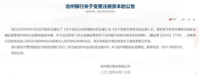 6月20日,沧州银行发布公告称,近日该行收到《河北金融监管局关于沧州银行变更注册资本的批复》,同意其注册资本由81.48亿元变更为89.63亿元,该行将相应办理注册资本工商变更登记手续。