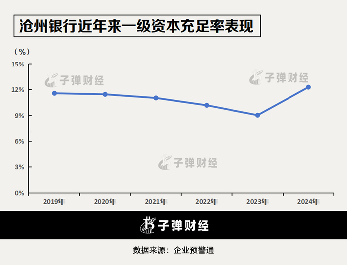 企业预警通数据显示,2019年末2023年末,该行核心一级资本充足率已经连续多年下滑,分别为11.58%、11.46%、11.04%、10.19%、9.04%。2024年,该行核心一级资本充足率回升至12.29%。