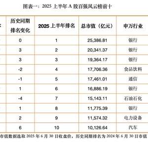 整体来看,受益于一揽子新政影响,A股市场震荡回升。截至2025年6月30日,2025年中市值百强榜隆重出炉,入围企业总市值41.63万亿元,较去年同期(截至2024年6月30 日,下同)的35.33万亿元增长17.83%。