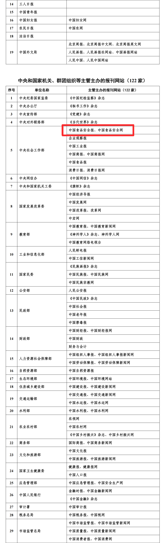 中国食品安全报、中国食品安全网入选!中央网信办公布新版《互联网新闻信息稿源单位名单》