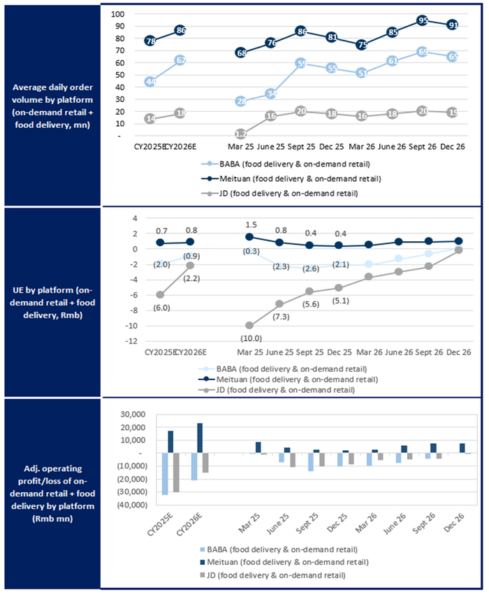 高盛预计:京东的外卖业务以及饿了么+淘宝闪购,在6月份的亏损分别达到人民币 -110亿元 / -70亿元,而全年分别亏损人民币-300亿元/ -410亿元。