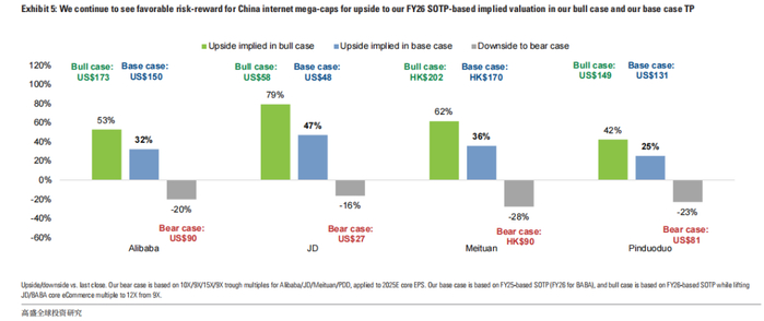 在熊市情境下,阿里目标价仅为90美元,京东目标价仅为27美元,美团目标价仅为90港元。