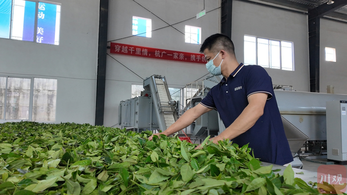 7月1日,地坪村“杭州—广元茶叶综合示范产业项目”里,工人正在摊晾新采摘的茶叶。张敏 摄