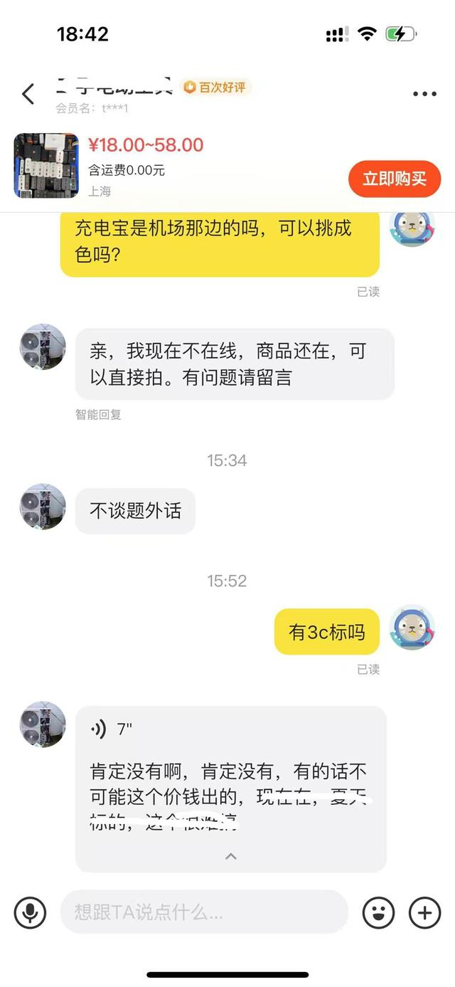 在该平台上,记者随机私信了几位显示所在地为上海的卖家,询问所售二手充电宝是否有3C标识,几名卖家均回复“没有”,其中一名卖家更是直言:“肯定没有啊,有的话不可能是这个价钱出。”当记者询问这么多充电宝从哪里来时,几名卖家却避重就轻,有的称是“渠道货”,有的说是“翻新机”,更有甚者直接拒绝回应,以“不谈题外话”结束对话。