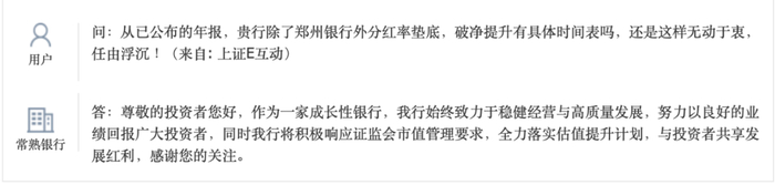 对于本次年中分红,常熟银行也表示,此举是为积极响应监管关于鼓励上市公司提升现金分红水平、增加分红频次、优化分红节奏的政策导向,进一步强化投资者回报,提升投资者的获得感和满意度,提振长期持股信心。
