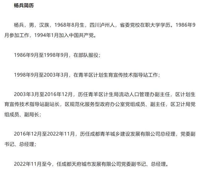 成都天府城市发展有限公司党委副书记、总经理杨兵被查