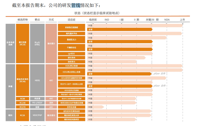 如RC88,是一种新型间皮素(MSLN)靶向ADC,用于治疗MSLN阳性实体瘤,能通过靶向结合MSLN阳性的肿瘤细胞,介导抗体的内吞,从而有效将细胞毒素定向传递给癌细胞,实现较好的肿瘤杀灭效果。目前正在中国推进一项RC88联合PD-1治疗晚期恶性实体瘤的II期临床试验。截至报告期末,已完成患者入组工作,正进行给药随访。