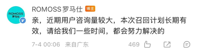 之后,针对客服已读不回的评论, 7月4日凌晨,罗马仕在评论区回复:近期用户咨询量较大,本次召回计划长期有效,请给我们一些时间,都会努力解决的。