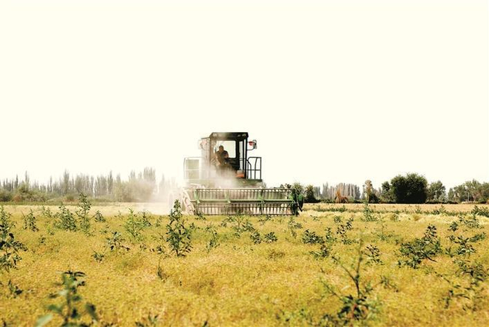 6月3日,一台收割机在棉花套种孜然地里收获孜然。作为夏收的首熟作物,孜然在6月份迎来集中收获期,一师阿拉尔市各团场积极组织机力人力,确保丰收的孜然颗粒归仓。 兵团日报常驻记者 林国强 摄