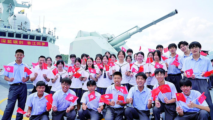 中国海军山东舰航母编队抵达香港。这是香港中学生登上海军运城舰参观、留影。