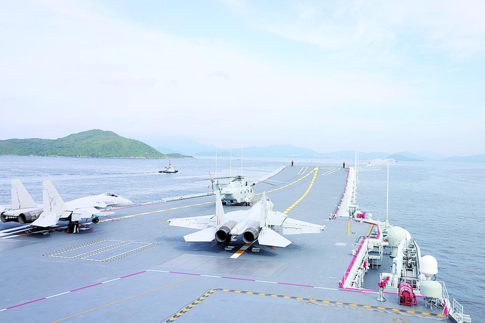 在香港回归祖国28周年之际,由中国人民解放军海军航空母舰山东舰,导弹驱逐舰延安舰、湛江舰及导弹护卫舰运城舰组成的航母编队,携多型舰载战斗机、直升机和陆战队员,于3日上午抵达香港特别行政区,开启为期5天的访问活动。香港特别行政区政府在昂船洲军营为舰艇编队访港举行隆重欢迎仪式。