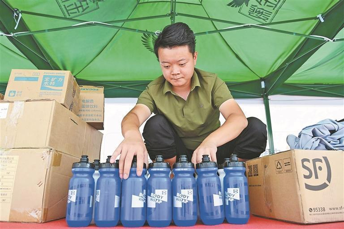 队内工作人员为队员准备训练所需补给。