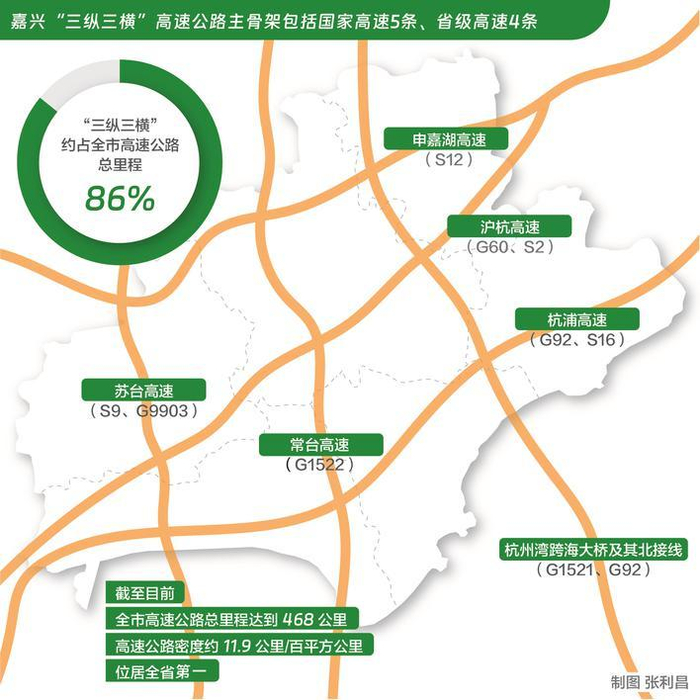 据嘉兴市交通运输局数据统计,截至目前,全市高速公路总里程达到468公里,高速公路百平方公里密度约11.9公里,位居全省第一。