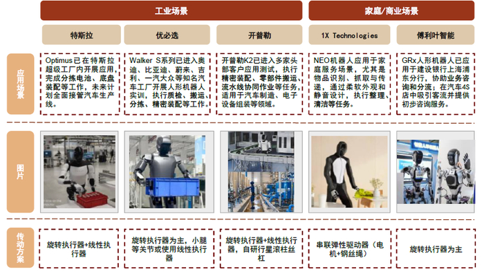 工业和家庭场景技术路线分化。1)线性执行器由于负载能力强、精度高,主要用于工业场景,特斯拉、开普勒的人形机器人应用于制造业的装配、搬运等任务,均采用行星滚柱丝杠,优必选正在研发滚柱丝杠,我们预计未来或用于部分下肢。2)家庭服务场景对安全性、价格敏感度高,丝杠增加机器人重量,或减弱安全性能。如1X Technologies的NEO机器人为保证人与机器人互动的安全,重量仅25-30kg,并采用轻量化的电机+钢丝绳传动方案。