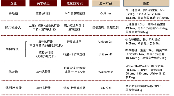 主关节:多路线并行,轻负载以旋转执行器为主。我们观察到国内以旋转执行器为主,主要为:1)国内终端客户价格敏感,在行星滚柱丝杠量产未成熟期,选择竞争白热化的减速器降本。2)应用场景导入阶段不同,国内B端验证应用以轻工业场景为主,如搬运零部件、挑选为主,负载能力20kg以内,重载场景尚未充分打开。