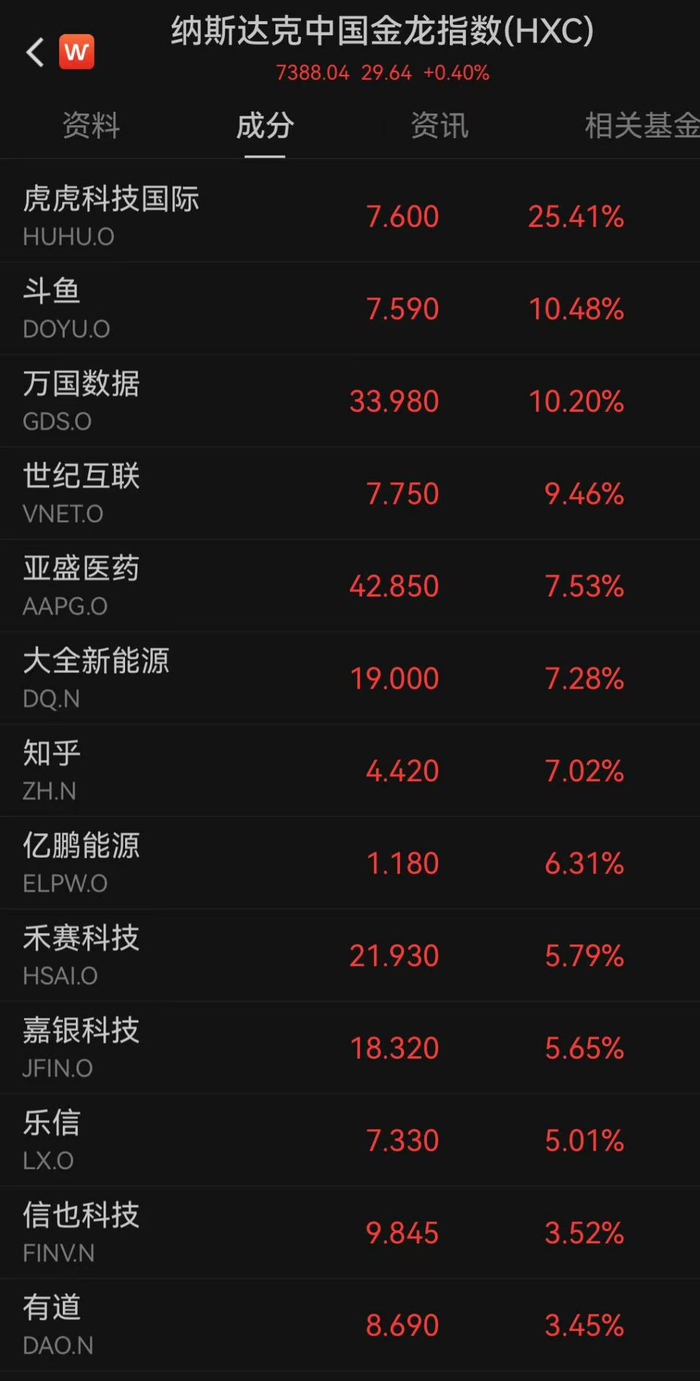 美股大型科技股涨跌不一,英伟达创历史新高。纳斯达克中国金龙指数收涨0.40%,虎虎科技国际涨逾25%,斗鱼、万国数据涨逾10%。