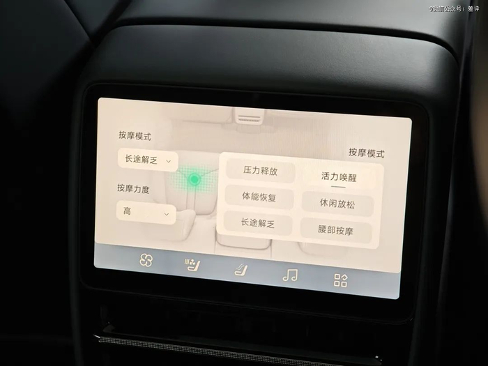 除了前后排都标配配备通风、加热之外,这个座椅有两个优点,一个是软,另一个是非常别致的按摩功能。