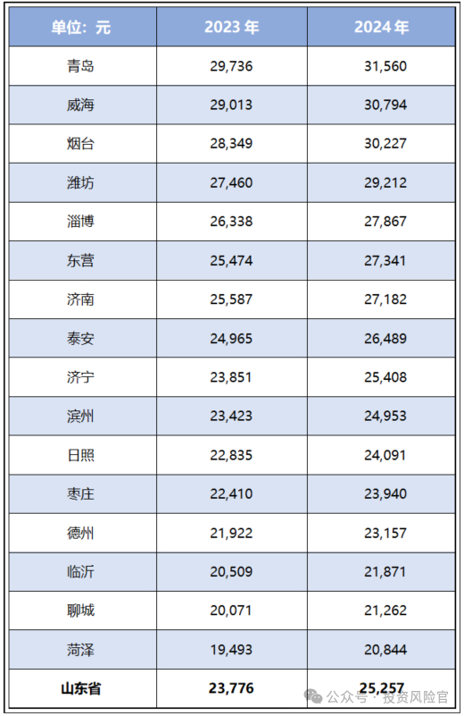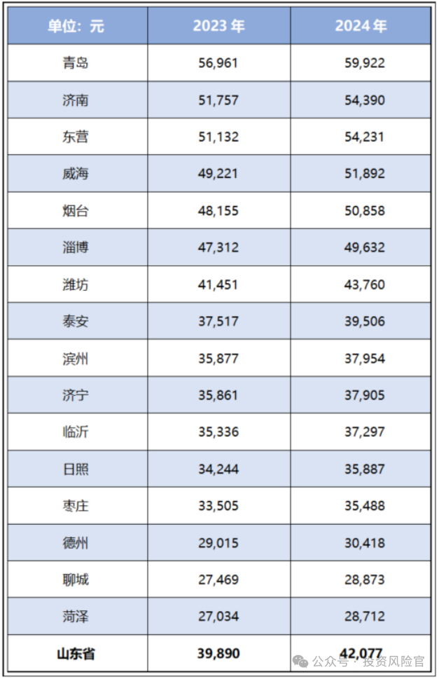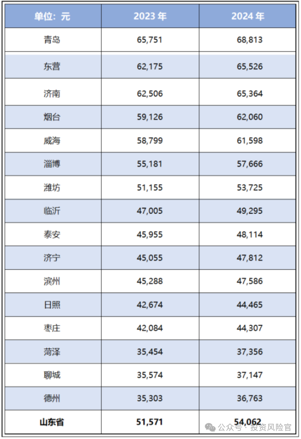 城镇居民人均可支配收入方面,2024年16个地市中依然是青岛、东营、济南、烟台和威海排在前五,且均超过6万元。
