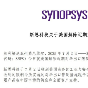 同时,新思科技(Synopsys)也表示,7月2日收到美国商务部工业和安全局的通知,称与中国相关的出口限制现已撤销,立即生效。新思科技正在努力恢复在中国销售最近受到限制的产品,并将继续评估与中国相关的出口限制对其业务、运营结果和财务的影响。