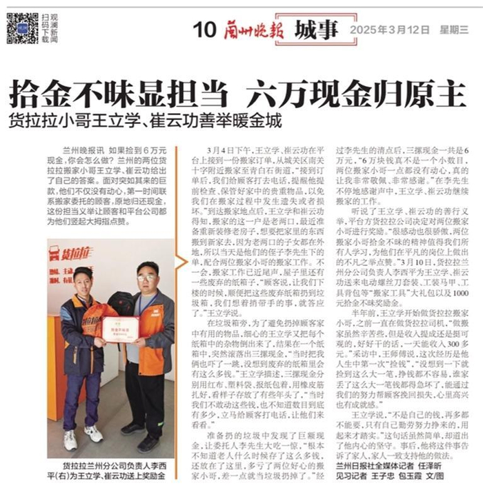 拾金不昧归还客户6万元 兰州货运师傅王立学获殊荣