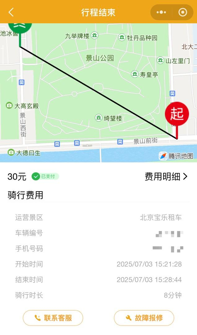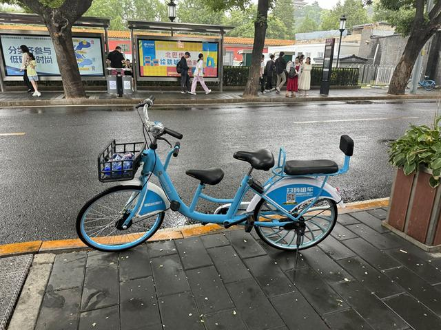 7月3日下午,记者在南锣鼓巷地铁口、景山公园西门和景山东街等地,均发现了这种特制的3座“亲子单车”。这些车辆颜色各异,车身上印着“奶爸车行”“哈哈乐骑行”“阳光租车”等不同品牌名称,但扫描二维码后都跳转到同一个名为“齐信共享单车”的小程序。与普通共享单车不同,使用这些“亲子单车”需先缴纳100元押金,骑行服务费高达30元/小时,且只要超过2分钟不足一小时也按一小时计费。“价格贵得离谱,但孩子走不动了,只能硬着头皮租。”一位正在扫码的母亲无奈地说。