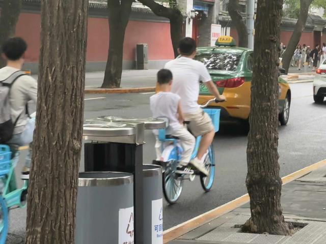 更令人担忧的是普遍存在的超载现象。根据《北京市非机动车管理条例》,自行车仅允许搭载一名12岁以下儿童。但从南锣鼓巷地铁口到景山前街的路上,短短半小时内就有十余辆载着两名儿童的亲子单车经过。有的家长让年幼孩子坐在前梁儿童座,较大的孩子坐在后座,三人同乘导致车辆重心不稳,骑行时左右摇摆。一位载着两名孩子的女士在躲避电动自行车时险些失控,场面十分惊险。