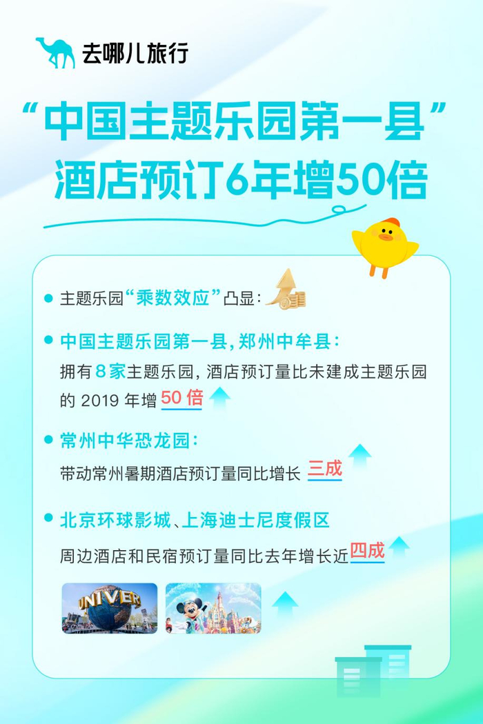 如郑州中牟县被称为“中国主题乐园第一县”,拥有包括郑州方特欢乐世界、只有河南·戏剧幻城、郑州海昌海洋乐园等8家主题乐园。去哪儿数据显示,今年暑期,平台中牟县酒店预订量比未建成主题乐园的2019年同期,增长50倍。