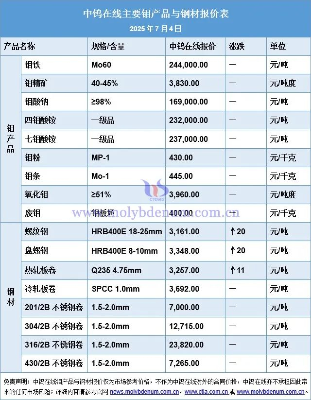 2025年7月4日钼价和钢价一览