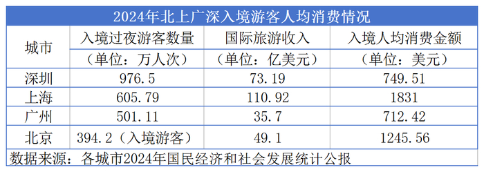 从消费金额来看,2024年,深圳人均入境消费金额为749.51美元,在一线城市中仅高于广州(712.42美元)。