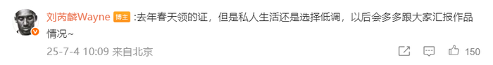 刘芮麟在该条微博下评论说明:去年春天领的证,但是私人生活还是选择低调。