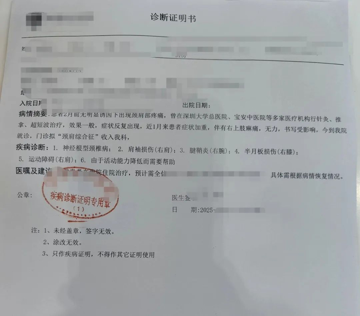 有一次,她去医院看病,还带着没批改完的作业。这个时候,她已经被诊断为手腕腱鞘炎、手肘筋膜炎,还有神经根型颈椎病等等。医生看到她,跟她说:「你都这样了,还在上班吗?」