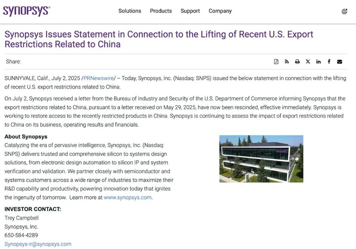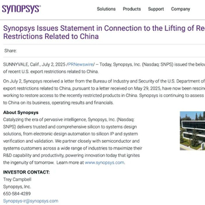 7月2日,新思科技官网发布消息称,收到BIS一封通知,2025年5月29日信函中要求对中国实施的出口限制现已撤销。新思科技正努力恢复受限产品在中国的销售。新思科技正在持续评估这对其业务、经营业绩和财务状况的影响。
