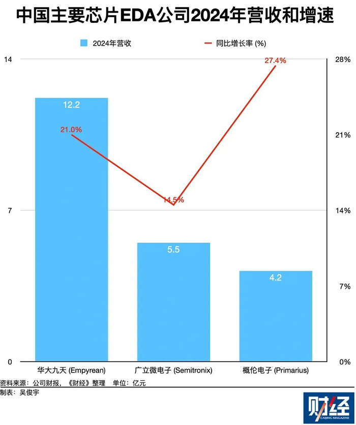 其中华大九天2024年营收12.2亿元,同比增长21.0%。概伦电子2024年营收4.2亿元,同比增长27.4%。广立微电子2024年营收人民币5.5亿元,同比增长14.5%