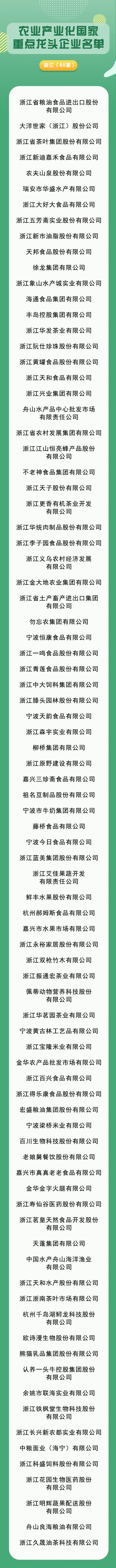 浙江85家!农业产业化国家重点龙头企业名单公布 浙江发布 浙江省人民政府新闻办公室官方账号 2025.07.0410:53 关注 转自:浙江发布近日,农业农村部官网公布了农业产业化国家重点龙头企业名单,全国共有2250家企业成功入围。其中,浙江85家在列。